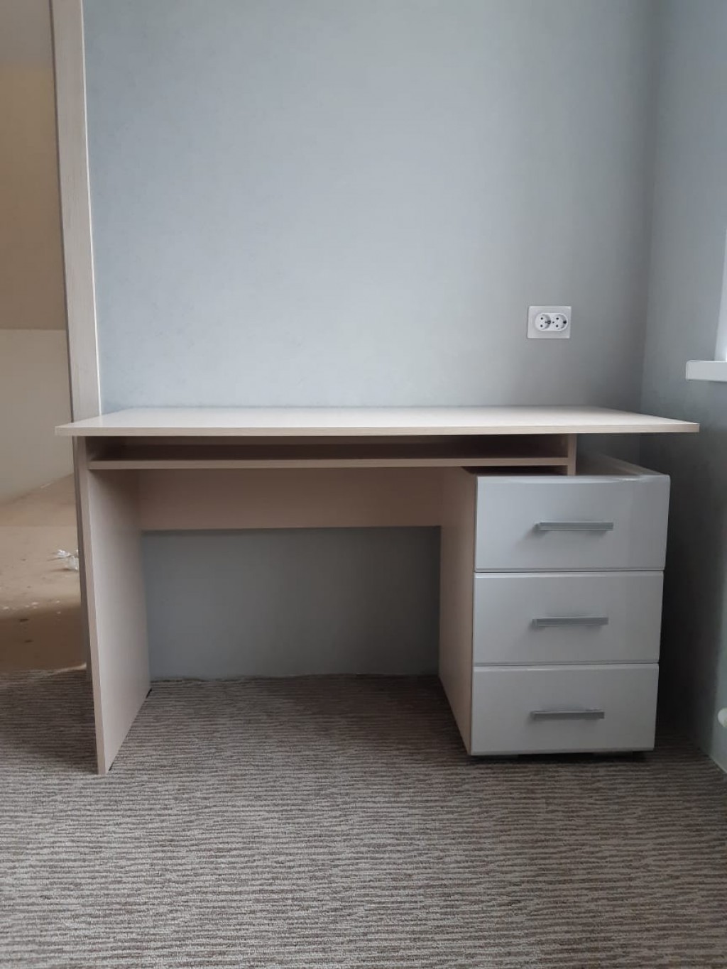 Компьютерный стол с тремя ящиками на роликовых напраляющих, с использованием механизма полного выдвижения и плавного закрывания. Дно ящика выполнено из ЛДВП в цвет корпуса. Внутреннее наполнение: полки из ЛДСП. Стол установлен на пластмассовых регулируемых опорах высотой 20мм. Ручки пластиковые размером 128 мм. Нагрузка на стол до 25 кг. Стол отлично компонуется надстройкой из модульной