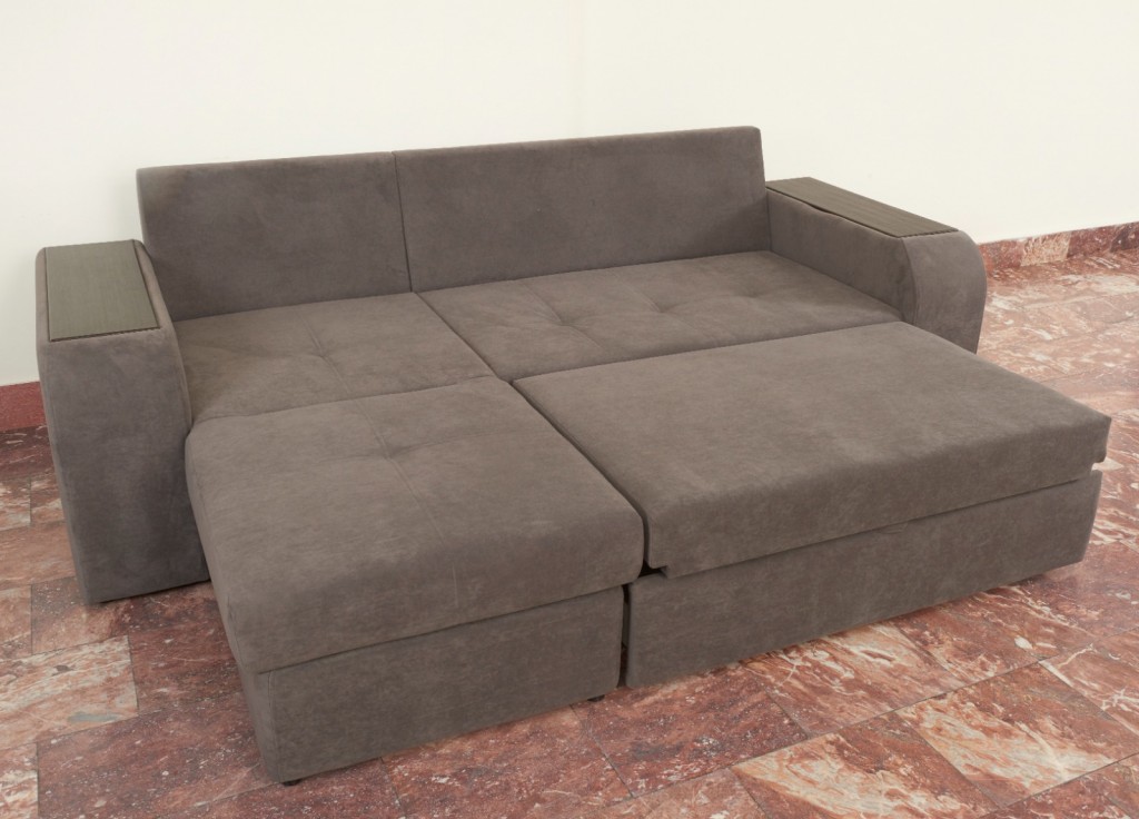 Угловой диван-кровать универсального стиля. В верхней части подлокотников, выполненной из материала МДФ, расположены встроенные ящики для постельных принадлежностей или хранения мелочей, дополнительно имеется бельевой ящик в оттоманке.